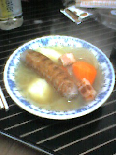 上の画像がチリビーンズ。基本は挽肉を使うのだけれど、私はベーコンを適当に切って代用。豆は2,3種類入れると味の単調さが無くなるので吉。 下はポトフ。真ん中にデンと鎮座しているソーセージはジョンソンビルのグリルドソーセージ。ソーセージは煮込みすぎると味が抜けちゃうので煮込みすぎないのが吉。 それにしても同じお皿というのは、ちょっと芸がない(^^;