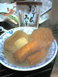 友人の自家栽培の三浦大根でおでんを作る。おでん用のとろ火が出来る環境ではないので、普通の鍋で一度煮立たせた後、鍋を毛布で2,3重にくるむ戦法。2日たつとそりゃもうとろけるような食感。素材は他に野菜天、げそ天、黒はんぺん、ジャガイモ、卵、ウィンナ。三浦大根とても美味しゅうございました>友人U