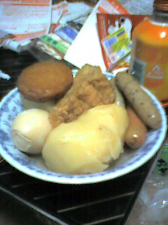 今度の素材は、さつま揚げ、厚揚げ、ジャガイモ(メイクイーン)、卵、ウインナ2種類。ジャガイモがとても美味しい。