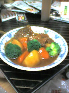 牛のすね肉をフライパンで焼き、水にコンソメ一個入れてワイン代わりの日本酒をぶち込み(ワインが手元になかっただけで本当は赤ワインがよろし)、ある程度煮込んだら、毛布でくるんで一晩おいとく。 タマネギとニンジンをフライパンで炒めてから、昨日の牛すねと一緒に煮込む。ハインツのドミグラスソース一缶ぶち込み、コンソメ2個、ウスターソース、ケチャップ適量、ナツメッグとクローブと黒こしょう少々。1時間ほど煮込んだら水にさらしたジャガイモ(きたあかり)を投入して更に30分ほど煮込む。できあがり直前にブロッコリをゆでておく。 皿に盛りつけ、彩りにブロッコリを。すね肉が柔らかくて最高(^_^)
