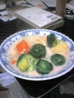 ほとんど晩ご飯日記と化しております。 今回はクリームシチュー。材料は鶏肉とタマネギと人参とジャガイモと芽キャベツとブロッコリと白マイタケ。以前の残り物+アルファですね。ソースのベースはハインツのホワイトソースを牛乳で延ばしたのだけれども、なんだかひと味足りない_| ̄|○。塩こしょうで調整してもやるがやっぱりこくがない。チーズをぶち込んで多少ましになるけれど、やっぱりなんだかもうひと味足りない_| ̄|○。やっぱりホワイトソースから作るしかないのかなぁ。