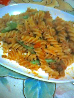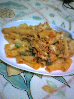 左のパスタはエリーケというねじれたヤツ。右はトルチリオーニというマカロニをぶっとくしたようなヤツ。ソースはどちらもトマトとツナとキノコとアスパラ。どちらも太めなのでチーズをかけてこってりさせる方が合う。