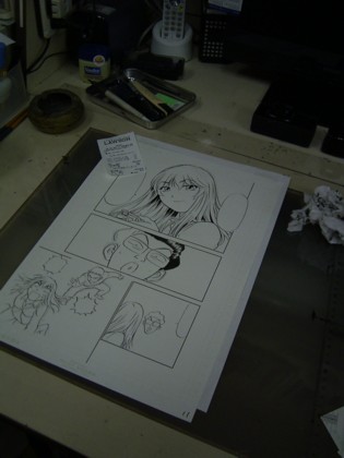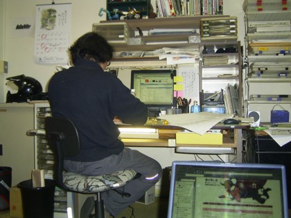 SEIJI氏の仕事風景 SEIJI氏はせっせと「WAVE」10話目のペン入れするが、基本的に私は邪魔してるだけ(^^;。初めてマンガ家の原稿書きを直に見ました。やっぱりプロは上手いモンですな。 深夜3時、SEIJI氏は自宅に引き上げる。私はそのまま事務所に泊めて貰う。