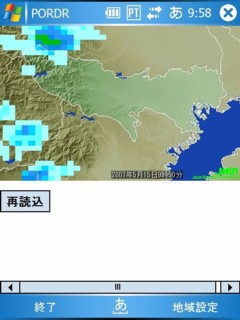 左は”PORDR”。日本気象協会の雨雲レーダーの画像を取り込んで表示するアプリ。10分ごとに画像が更新されるので、雨模様の参考になる。