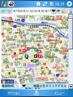 左は”W−ZERO3MONITOR”。基地局の情報と基地局間の電界強度から、おおよその現在位置を表示するソフト。郵便番号情報から地名を表示してくれるのと、主要駅の座標を表示できるので、大まかな位置把握が可能。