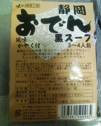地元では静岡おでんを”しぞーかおでん”と発音するとか云われているが、地元の人間がわざわざ静岡おでんとは呼ばない(^^;。少なくてもわたしが子供の頃は単におでんで、しかも世の中のおでんという物はすべからくこの真っ黒いスープで出来ていると思いこんでいた。 関西風のきれいなダシのおでんも好きだが、時折このディープなダシのおでんを無性に食べたくなる。 というわけで先日のGWに帰省した際に地元のスーパー買った来た静岡おでんの素を試してみる。