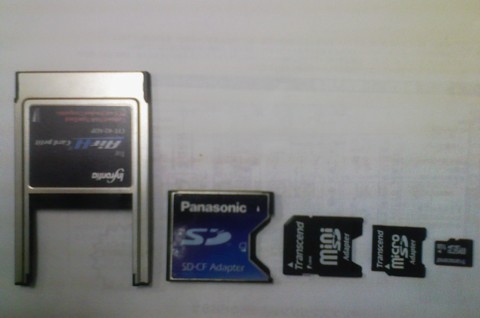 左からPCMCIAタイプ2・コンパクトフラッシュアダプタ、コンパクトフラッシュ・SDカードアダプタ、SDカード・miniSDカードアダプタ、miniSDカード・microSDカードアダプタ、microSDカード(1GB)。アダプタ4段重ねで認識するかどうか試してみましたが、ちゃんと認識しました(^_^)。 暇だねオレも。