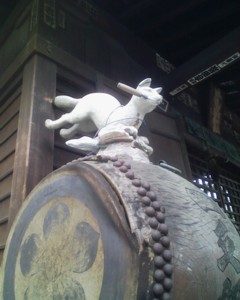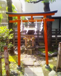 拝殿の左脇には太鼓の上に乗った狐がいます。咥えているのは「鍵」なので、家内安全、商売繁盛のご利益もあるようです。本来ならば左右にいると思うのですが、左側にしかいません。右の写真は同じ境内に祀られていた金山様。元々金座で祀っていたものを移したようです。高さ2mくらいの小さな鳥居です。