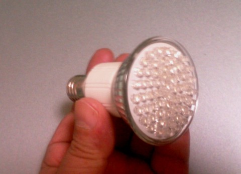 秋葉のジャンク屋で購入した今話題のエコロジー品LED電球。値段は840円。小さなLEDが60個付いている。消費電力は3Wで明るさは多分白熱電球の30〜40W位の感じ。ただしLED特有の白さなのでちょっと寒々と暗く感じる。これ以外にLED20個を使った1.2Wタイプも480円で購入したが、さすがにこちらはちょっと暗すぎた。30〜40W位程度の明るさがあれば実用にはなる。ただし口金がE17というミニライト用。HPで確認したらE26の口金もあるようなので、今度はそちらを探してみよう。
