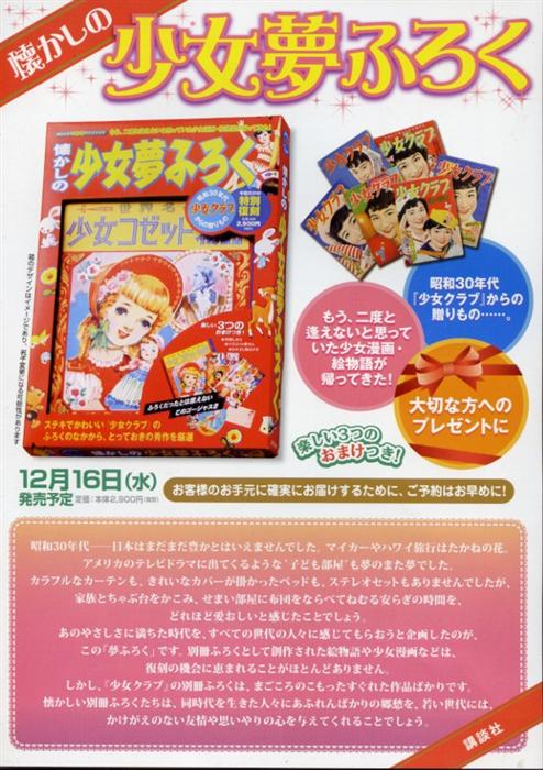 サマープディング、チーズクリーム添え。イギリスで夏場に作られるデザート用のプディング。ボールに耳を切った食パンを敷き、軽く煮たブルーベリーやクランベリーを詰め込む。土台部にクリームチーズとヨーグルトを混ぜた物を流し込む。良く冷やすとワリカシあっさりしていて美味しい。 選集店に講談社の人が訪れ、チラシを置いていく。 昭和30年代初頭の講談社『少女クラブ』の付録を復刻した物を刊行するそうです。勝山ひろし、江川みさお挿絵の絵物語や谷川一彦の付録マンガが読めます。ちょっと楽しみ。 最近ちょっと気になっているマンガ。