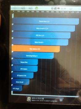 Android用ベンチマークソフト、quadrant standardで計測。1000弱程度の数値が出る。これがどのくらいのレベルかといえば、モトローラのDOROID Xよりちょっと遅くてGALAXY Sよりちょっと早い。ただし比較対象のDROIDO XとGALAXY SはOS2.1のようなのでそこら辺はちょっと割り引く必要あり。 でもまあ普通に使っていて、遅いとかモッサリ感は余り無い。動画再生もフルHDでなければほとんど問題なし。CORETEX A8系で800MHZのプロセッサなのでフラッシュ動画に関してもちょっと不安定だが、一応動作に問題ない。 ネット上で見受けられるWiFi落ちとかアプリ不安定はあまり見受けられない。ファームウェアがそれなりに改善されている模様。 ただしハードウェアに起因するいくつかの問題は相変わらず。 ・まず最大の問題がタッチパネルの震え。アイコンを長押しするとブルブルと震える症状を起こす。これが震えだけならばそれほど問題はないのだが、震えついでに押されていることを見失うケースがあって、押し続けているにもかかわらず、長押し状態が勝手に解除される。アイコンの移動などが上手く出来なくなってとても困る。これは推測だが、タッチパネル周りにのノイズが載っているようだ。多分液晶のノイズがフラットケーブルを介して、タッチパネルに回り込んでいるんじゃないのかな。特に縦長方向に震えの症状が強く出る。 ・次に電源問題。実はこのモデル、スリープ動作がうまくいかない。いちおうスライド式の電源スイッチをON-OFF-ONと素早く動かすとスリープするという仕様らしいのだが、わたしの機種では100%そのままフリーズする。 バッテリー残量もいい加減というか、充電コントロール大丈夫?というレベル。一応公証の4時間駆動はギリギリするが、バッテリー残量表示がかなりイイ加減。ACアダプタを外すとみるみるうちにバッテリー残量が減るが15%位になると突然減らなくなる。ACアダプタを挿すと挿した瞬間に20〜30%は数値が跳ね上がる。どうもまっとうな電源管理しているとは思えない。というかバッテリー容量が異なる亜種が存在する時点でまっとうなバッテリー管理がしていないのは自明か。 ・縦位置の基準がおかしい。