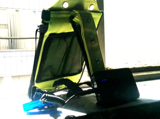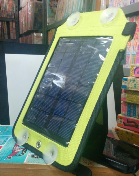 前々から興味はあったが、どの程度実用になるかさっぱりわからなかった。しかしまあ値段も安くなってきたし、防災上の備えもあるので試しに購入してみた。 ちょっとアウトドアに向きそうなスタンド兼布ケース、吸盤、ベルト付きを選んでみた。最大6V出力で2.2Wとのふれこみ。店の店員は直射日光下、3時間で1000mAh位と説明してくれた。メーカ名とか型番とか一切表記がない。ひょっとしてイケショップオリジナル? 太陽電池面のサイズは12cm×16cmくらい。外側のケースを入れても雑誌より一回り小さいサイズで、わりかしコンパクト。非常持出しのバックパックに入れておくのに問題ないサイズである。 値段は税別1980円と格安。 変換効率的にはどんなもんかをちょっと計算。 現在市販で変換効率のよいという触れ込みのシャープ製太陽電池は理論最大効率で 220W ÷ 11533 cm2 = 0.019(W/cm2) で1平方センチ辺り0.019Wという計算になる。 でまあこの商品はというと 2.2W ÷ 192 cm2 = 0.011(W/cm2) で1平方センチあたり0.011W。 シャープ製と比較して6割程度の効率となる。値段から考えるとわりかし悪く無い。 じゃあ実際使い物になるかどうか実験。 手持ちのUSBモバイルバッテリーとUSBの電流計繋いで電流値を測定。